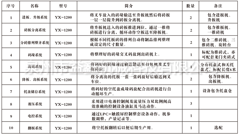 本自動碼垛系統(tǒng)可將不同型號磚機生產(chǎn)的不同規(guī)格的砌塊進行磚板分離,排塊整理最后排成1000-1200(mm)的方垛進行碼放(標準實心磚一次碼放高度最多達12層)經(jīng)出磚可選擇進行纏繞膜打包。配合叉車抱夾可不用托盤直接抱到場地碼垛,堆放高度可放3垛。 整套系統(tǒng)采用PLC+觸摸屏控制,只需一個人操作。日碼磚量約3800板/班.可大大節(jié)約人工成本。